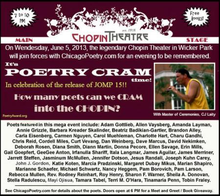 Wed June 5th - CJ Laity is back, hosting his first big poetry extravaganza of 2013. Over the past two decades, Laity has hosted huge Chicago poetry showcases for the Chicago Tribune Printers Row Book Fair, the Chicago Public Library, the Bucktown Arts Fest, the Printers Ball as well as for countless other events and venues.