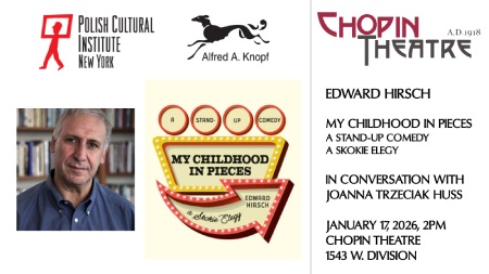 Sat Januarty 17th 2p - Edward Hirsch reads from My Childhood in Pieces: A Standup Comedy, A Skokie Elegy and speaks with Prof. Joanna Trzeciak Huss about comedy, memory, and his journey to poetry–plus a short film on Polish poet Ryszard Krynicki by Ewa Zadrzynska (Poetry Unites). Reception and book signing follows.