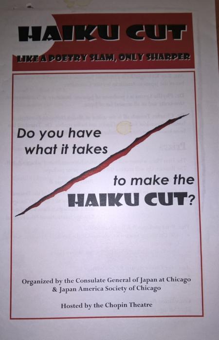 Prizes await Poetry Slammers with the best spoken haiku in a series of head-to-head face-offs. Judges are Dr. Phyllis Lyons Professor Japanese Literature Northwestern University; Dr. Charles Trumbull editor Modern Haiku and Ms. Kayoko Kawaguchi a bilingual Japanese poet.