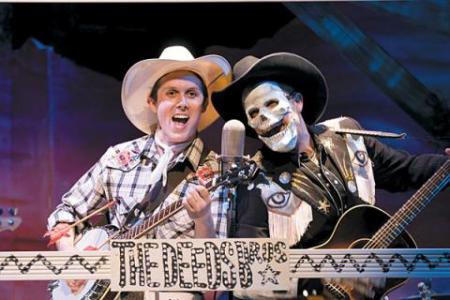 Not only do Langford's rich songs make up the score, which is a complex pleasure, but Lee Keenan's deliciously vibrant and original visuals are inspired by Langford's own art. This is a show that traffics in archetypes, certainly. What is more archetypal than the story of a washed-up cowboy, flattened by artistic compromises and headed for assisted living? But the artists behind this piece are sophisticated enough to manipulate the archetypes even as they wallow in them. He's certainly too young for the role, but Allen throws himself into Lofty's malaise with a beguiling mixture of sadness and spunk. And time and again, this show finds fresh ways to embody old dichotomies. The record industry is here represented by a many-headed besuited beast; past country greats don't let the frames of their own hall-of-fame portraits stop them from singing; and in the relationship between Lofty and his dear, culturally purer brother Lefty Deeds, subtly played and sung by Patrick Martin, we get a tinge of how success invariably comes with a measure of artistic and personal regret. How can it not?