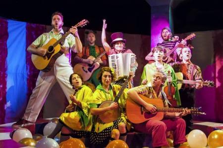 The setting is a circus, one large and one small ring, with characters by and large shown as the clown-like troubadours that they are. That atmosphere is established from the moment the space is entered into with performer and audience sing-alongs of folk-rock repertoire and games of catch with balloons, et al, ensuring connective interplay between the audience and the performers before the work itself begins and requiring the audience to move along with the action, often literally.