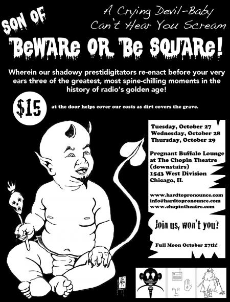 8p Tue (10/27), Wed (10/28), Thu (10/29) - Wherein our shadowy prestidigitators re-enact before your very ears three of the greatest, most spine-chilling moments in the history of radio’s golden age! Son of BEWARE or Be Square! is a live re-enactment of old-time radio shows produced and directed by Andrew Gregory Krzak. He and his fellow actors will perform 3 nights nights during Halloween week using only their voices and live sound effects in the elegant Pregnant Buffalo Lounge $15.00 covers our costs like dirt atop a coffin!