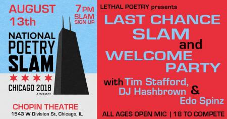 Mon 8/13 @ 7pm - This is the official WELCOME PARTY and fundraiser for the 29th annual National Poetry Slam - WORLD'S LARGEST POETRY COMPETITION Hosted by The Lethal Poetry Collective.