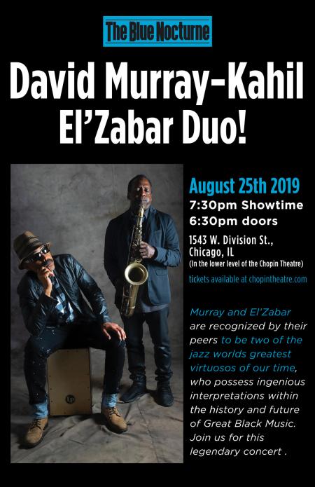 These two modern music masters, have been at the forefront of creative exploration and compositional diversity over the past four decades. Murray and El'Zabar are recognized by their peers to be consummate virtuosos, who possess ingenious interpretations within the history and future of Great Black Music! This magnificent duo, shares with us all, the hope and desire that comes from blowing fire in an acquired wisdom. This is freedom music in its noblest sense, meant to heal and release one from the regurgitated mediocrity currently flooding our airways. These two wise men know firsthand what's genuine and real. They have both played and recorded with the legends. To witness these time proven masters in person, is to be exalted and rejuvenated! They are the miracle of a profound sound, within a priceless opportunity not to be missed! These cats express brilliantly what true musicians feel and see, which is the epiphany to be free! They are body and soul, in a moment's notice, that ignites the call to have a ball with the one and only Murray/El'Zabar Duo!