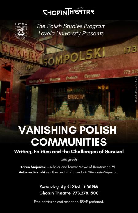 Loyola University Chicago Polish Studies Program and Chopin Theatre invite you to discussion on the disappearing Polish communities in large and smaller cities. With Karen Majewski and Anthony Bukoski moderated by Prof John Merchant.