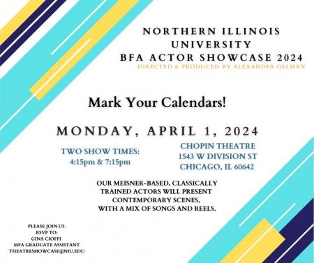 Northern Illinois University invites you 2024 BFA Actor Showcase. Its Meisner based classically trained actors will present both contemporary and classical scenes with a mix of monologues and reels.