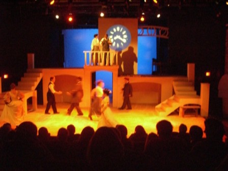 "Time does not behave itself in the manner in which we have become accustomed in Einstein’s Dreams, currently in production at Chopin Theatre, 1543 W. Division St. Produced by Clock Productions in association with The Moving Dock Theatre Company, the performance consists of a series of scenes, set in the Swiss village of Bern in 1905, that bring to life the science-induced fever dreams of the young Albert Einstein, who lived in Bern while he worked on his now-famous theories of relativity. Co-directors and co-adapters Patrizia Acerra and Dawn Arnold have created Einstein’s Dreams in response to the best-selling 1993 novel of the same name, written by Alan Lightman. Those who are fascinated by discussions of the physics of time should not miss this show. Others may wish that Clock Productions had spent its rich resources of design, performance and directing skills on material that reached deeper into what makes humans tick. The possibilities of an existence in which time is not an absolute are intriguing. Perhaps time stops, every now and then, just for a thousandth of a second or so. No one would really notice, but the infinitesimal gap could be enough for the flicker of an idea to enter someone’s mind and change the course of the future. Perhaps time exists on three levels at once, as space does. Any given moment in a life would, then, play out to three different conclusions, simultaneously and in different realities.On an elegant, classically designed set of staircases and archways, an ensemble of eight young, attractive performers waltz through their paces as turn-of-the-last-century Swiss villagers, illustrating scenes in which time bends, stops and stutters. Courting, picnicking, and chatting on the street, the characters move with pristine precision through choreography that is as charmingly exact as a Swiss clock, and?unfortunately?not much more emotionally engaging. Acerra’s and Arnold’s work is most effective when it exploits strong visual or aural images to bring their "what-if"s into focus. In a scene where the villagers wake up each morning with no memory of their past lives, each performer carries a big book that glows with a light from within. As the narrator describes their lives to us, the characters are reading their own histories, punctuating the narrative with gentle exclamations of surprise and delight. An inexorable metronome dominates another scene, in which two couples at dinner move and speak in strict time, which gives a pleasing rhythm to their behavior while pointing out its utter vapidity.Moving and speaking with confident, though self-conscious, grace, the actors all appear to be in their early twenties?a homogeneity of age that unintentionally flattens out a dramatic exploration of time. Carol Blanchard created the charming period costumes in a monochromatic color scheme of ivories and grays that evokes a past that has faded away. Tamora Wilson pours lush lighting onto the terrific set by David Denman. David DeLaFuente created the sound score, which dovetails seamlessly with the text and movement.Reflections on time as our prison-keeper, our god, our constant companion or a mischievous trickster are interesting to consider but difficult to take personally. Like dried flowers that crumble when they?re touched, this beautiful, expertly realized production ultimately feels brittle and distant" - Kristin Gehring, Chicago Journal 11/05