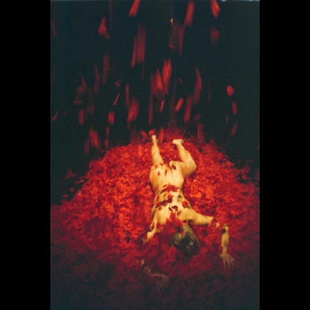 "The final image in "Aztec Hotel," one of two works by Poland's Teatr Cogitatur now running in rotating repertory at the Chopin Theatre, features a beautiful, bare-backed woman lying face down on the ground, nearly buried in lush red rose petals. It is so reminiscent of that scene in Sam Mendes' 1999 film "American Beauty" -- the one in which actress Mena Suvari is similarly bathed in rose petals -- that you may begin to wonder which director, Mendes or Poland's Witold Izdebski (and his collaborator, Katarzyna Mrozinska-Izdebska) -- saw the other's work. No matter: The scene is a dream of perfection -- the ultimate fantasy of youth, beauty and the fullness of life captured in that precarious moment when the greatest glory is just about to flip into an awareness of mortality.No one who has seen Cogitatur's other production, "La Luna," will fail to realize that this is an ensemble with a signature style -- a theater of poetry animated by light, sound, movement, color and powerful images that seem to emerge from the darkness in a few moments of blinding luminescence, and then retreat back into the void. There is no script at work, aside from such rambling lines as "We don't know ourselves or anything else." But the images created by the actors and designers conjure a kind of erotically charged delirium that allows you to free-float and associate, to weave your own dream or nightmare scenarios for a time-out-of-mind hour in the theater. The Aztec Hotel, like the jazzy La Luna nightclub, is a state of mind. In this case, it seems to be inhabited by beings from another universe who land here thanks to their strong but delicate wings (the images of flight are gorgeous, with hints of Icarus and Leonardo da Vinci and even the Wright brothers). "It always comes to an end," intones one of the characters. And then we see a man in a dense fog, running furiously in place, and two winged creatures perched atop towers -- a vision eerily evocative of the World Trade Center attack and those who jumped in terror. The actors of Teatr Cogitatur are as physically expressive as dancers, with the men's almost cadaverously thin bodies an eloquent embodiment of the human form on the edge of life and death. There is rain, wind and fire in "Aztec Hotel." There is flight and stasis. There is pleasure and pain" - Hedy Weiss, Chicago Sun Times 8/24/05
