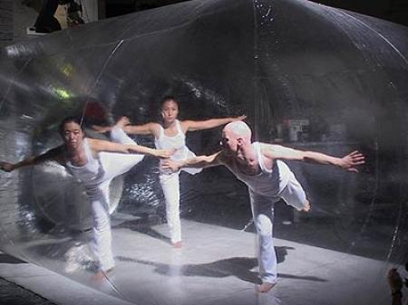 “The three performances that constitute the show Dwellings all examine the spaces people call their own. Joseph Ravens presents two pieces: Transparent, in which two people dance inside of a clear bubble, and Nest, a work for six people that examines communication and accumulation. Joining Ravens on the bill are the Local Infinities presenting Skin, which uses wax as an epidermal metaphor.” Cara Jepsen, Chicago Reader March 10, 2000